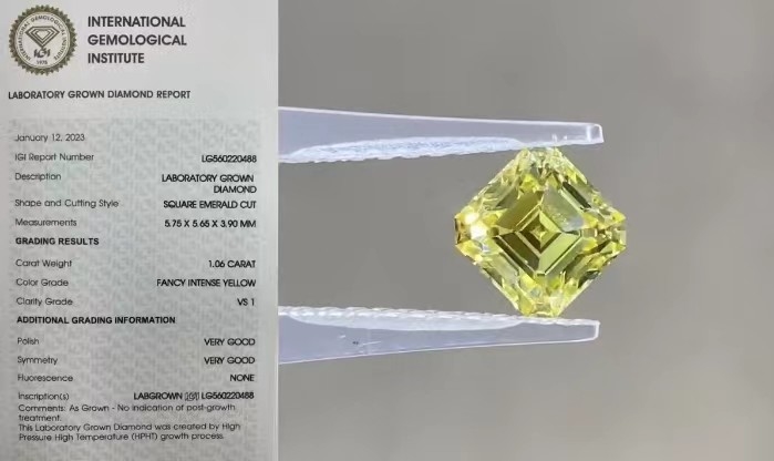 Diamantes sintéticos certificados Diamantes amarelos criados em laboratório 1CT Diamantes de corte Asscher
