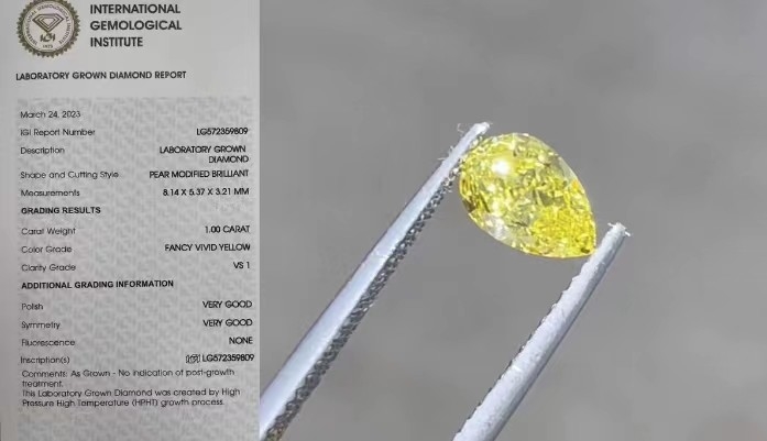 Certificado Diamante solto Diamante sintético Grito 1CT Forma de pera Amarelo Diamante de laboratório VS1 Diamante