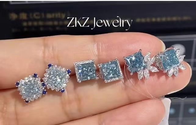 Jóias de diamantes de laboratório estilo clássico Princesa azul e brincos de diamantes de corte redondo para festas e aniversários.